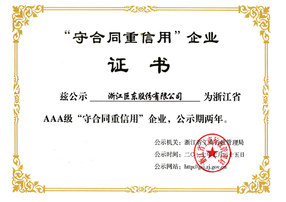 • 2017 AAA contract abiding and trustworthy enterprise in Zhejiang Province